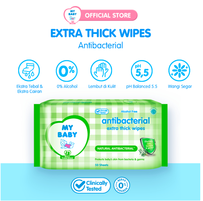 Dari sisi formulasi, ini adalah poin krusial bagi NUE. MY BABY Antibacterial Extra Thick Wipes telah teruji secara klinis dan yang terpenting, bebas alkohol. Ini berarti Kami tidak perlu khawatir kulit sensitif si kecil akan mengalami iritasi. Formula antibakterinya bekerja ampuh untuk membunuh kuman dan bakteri yang menempel. Kandungan utamanya adalah Tea Tree Oil, yang memang dikenal memiliki sifat antibakteri alami untuk melindungi kulit bayi dari kuman dan bakteri. Beberapa sumber juga menyebutkan produk ini memiliki pH netral 5.5 yang ramah untuk kulit bayi, serta telah bersertifikasi Halal. Desain kemasannya pun praktis dan mudah dibawa bepergian, menjadikannya teman setia di setiap petualangan si kecil.
