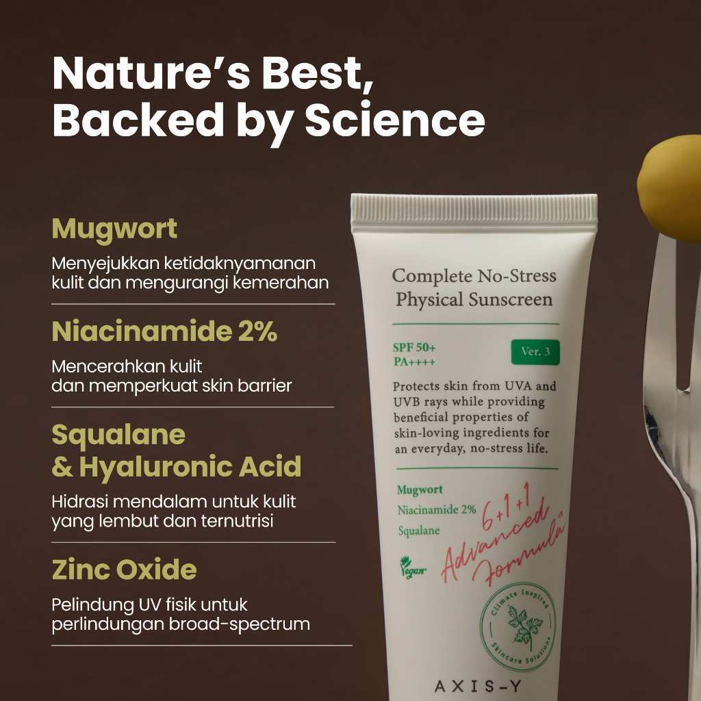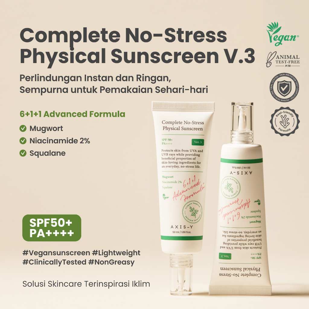 AXIS-Y Complete No-Stress Physical Sunscreen Ver. 3 SPF 50+ PA++++ benar-benar menepati janjinya sebagai sunscreen mineral yang tidak hanya memberikan perlindungan superior, tetapi juga merawat kulit dengan bahan-bahan aktifnya. Formulanya yang telah ditingkatkan berhasil mengatasi masalah umum physical sunscreen seperti white cast dan tekstur berat, menjadikannya pilihan yang sangat nyaman untuk penggunaan sehari-hari.