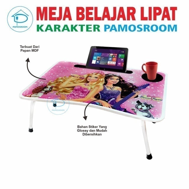 Desainnya sendiri sangat menarik, sesuai dengan namanya "Meja Belajar Anak Karakter". Pamosroom menyediakan berbagai pilihan karakter kartun populer seperti Doraemon, Hello Kitty, Little Pony, Spiderman, Tayo, Unicorn, dan banyak lagi yang tentunya akan disukai anak-anak. Meja ini juga didesain sebagai meja lipat, sering disebut "model koper lipat" atau "portable lipat". Beberapa varian juga dilengkapi dengan laci kecil di bawahnya untuk menyimpan alat tulis seperti krayon, atau bahkan slot khusus untuk handphone/iPad dan tempat minum untuk kenyamanan ekstra.
