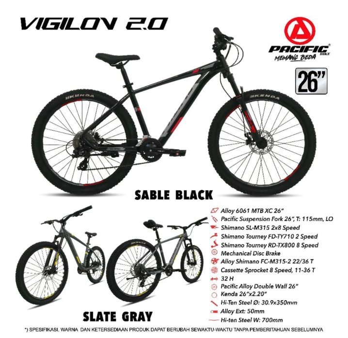 Pacific Vigilon 2.0 26 Inch besutan Roda Pasifik Mandiri ini dibangun dengan fondasi yang kokoh, dimulai dari rangka Alloy 6061 MTB XC 26 inci yang ringan namun kuat. Desainnya terlihat gagah dan modern, tersedia dalam pilihan warna Sable Black, Slate Gray, atau Scarlet Black.