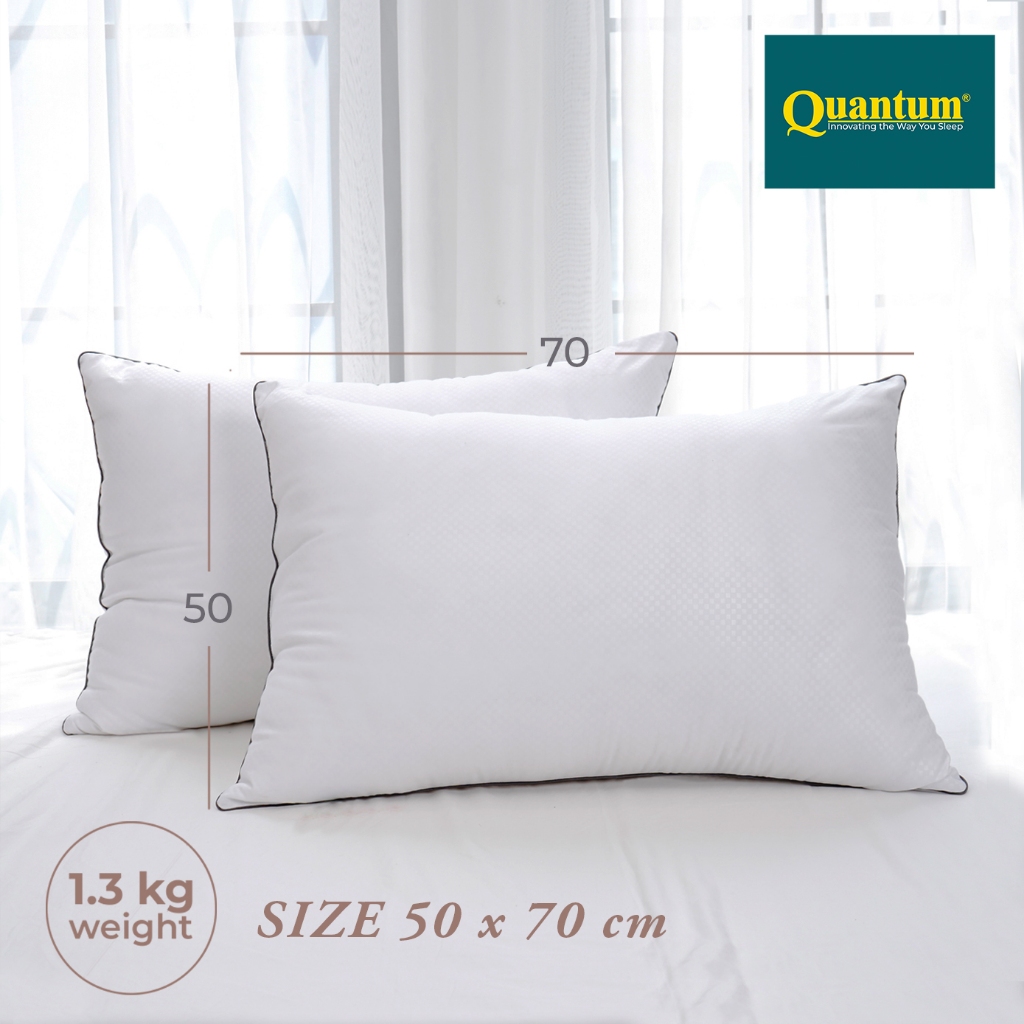 Secara dimensi, Quantum Hotel Pillow hadir dalam ukuran standar 50 x 70 cm dengan jahitan single-list. Jahitan single-list ini tidak hanya fungsional, tetapi juga turut memberikan kesan mewah dan modern pada tampilan bantal. Bantal ini memiliki bobot sekitar 1.300 gram atau 1,3 kg, terasa solid dan mantap saat digunakan, serta mampu memberikan dukungan yang konsisten sepanjang waktu istirahat. Quantum Hotel Pillow juga dikemas dengan Printed Plastic Packaging yang rapi dan praktis.