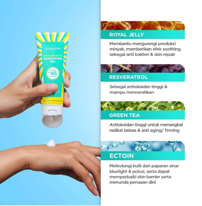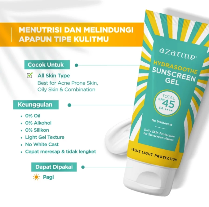 Sebagai produk unggulan dari Wahana Kosmetika Indonesia, Azarine® Hydrasoothe Sunscreen Gel SPF 45 PA++++ adalah tabir surya berbentuk gel berbasis air yang sangat ringan, memberikan sensasi dingin, dan mudah meresap ke dalam kulit.