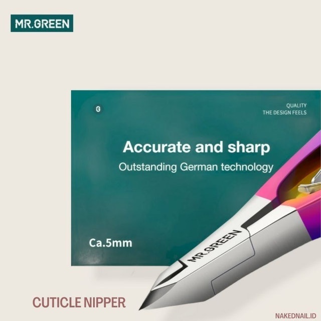Mr. Green Cuticle Nipper/Pusher dibuat dengan standar kualitas tinggi, yang langsung terlihat dari material dan teknologinya. Produk ini menggunakan baja tahan karat kelas medis atau surgical grade stainless steel, memastikan daya tahan yang luar biasa, ketahanan terhadap karat, dan ketajaman yang tahan lama. Ini berarti Anda tidak perlu khawatir alat Anda akan cepat rusak atau kehilangan performanya.