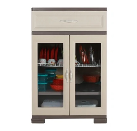 - Desain Fungsional & Estetik: Dengan tekstur kayu yang elegan dan beberapa model dilengkapi pintu kaca, lemari ini tidak hanya fungsional tetapi juga mempercantik tampilan dapur. Rak piring berongga dan laci serbaguna menambah kepraktisan penyimpanan.