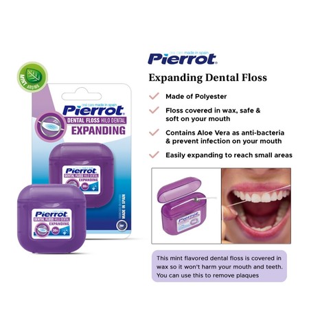 Pierrot Dental Floss Hilo Dental Expanding dirancang dengan konsep "expanding" atau mengembang. Awalnya, benang ini tampak tipis dan ramping, sehingga mudah diselipkan di antara sela-sela gigi, bahkan yang paling rapat sekalipun. Namun, begitu bersentuhan dengan air liur dan kelembapan di dalam mulut, serat-serat benang yang umumnya terbuat dari bahan lembut dan berserat seperti poliester ini akan menyerap kelembapan dan mengembang. Peningkatan diameter dan area permukaan ini memungkinkan benang untuk menyesuaikan diri dengan kontur unik dan celah gigi yang bervariasi, memastikan pembersihan yang lebih efektif..