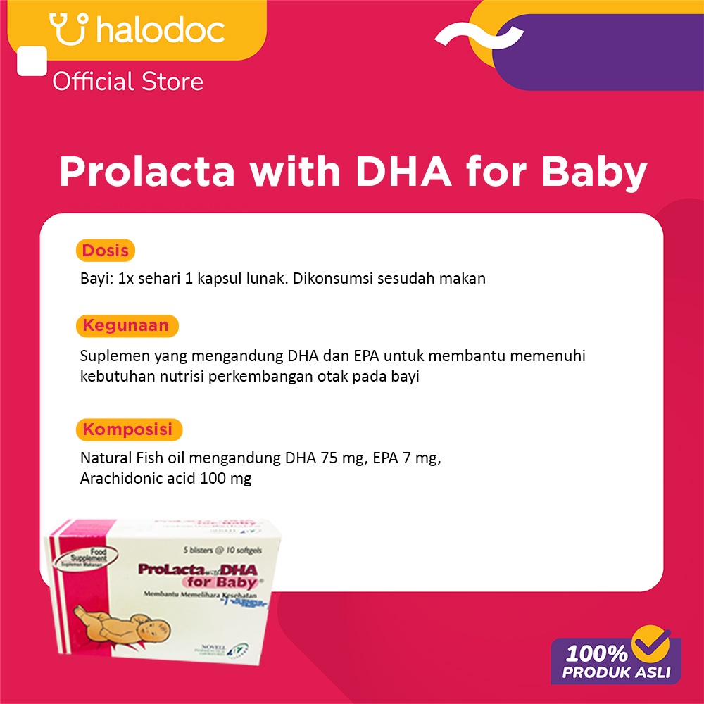 Prolacta with DHA for Baby merupakan suplemen makanan bayi yang diproduksi oleh Novell Pharmaceutical Laboratories. Produk ini hadir dalam bentuk kapsul lunak (softgel) yang mudah diberikan kepada bayi. Dalam setiap kapsulnya, Prolacta with DHA for Baby mengandung kombinasi nutrisi penting: 75 mg Docosahexaenoic acid (DHA), 7 mg Eicosapentaenoic acid (EPA), dan 100 mg Arachidonic acid (ARA). Kandungan ini diformulasikan untuk menunjang perkembangan otak bayi secara optimal, memenuhi kebutuhan gizi, serta memperkuat daya tahan tubuhnya.