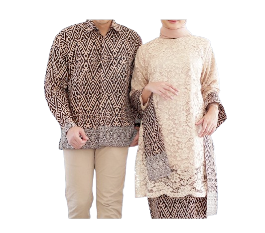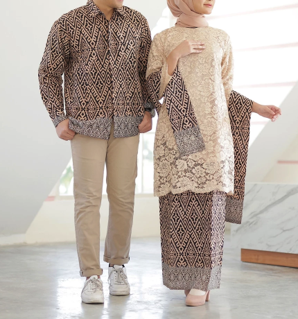 Kebaya dengan brokat premium dan furing kaos juga memastikan kenyamanan tanpa mengurangi estetika. Furing kaos ini tentunya sangat membantu mencegah rasa gatal dari brokat dan memberikan lapisan yang lembut di kulit. Desain rok span dengan pinggang kerut juga praktis dan adaptif, memberikan keleluasaan bergerak namun tetap menjaga siluet yang rapi dan feminin. Keselarasan motif dan warna antara kemeja pria dan kebaya rok wanita menciptakan kesan harmonis yang kuat, membuat NUE dan pasangan tidak hanya tampil kompak, tetapi juga memancarkan aura kebersamaan yang elegan. Ini adalah pilihan tepat untuk menunjukkan keindahan budaya Indonesia dengan sentuhan modern.