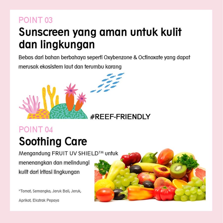 Salah satu fitur unggulan yang membuat kami terkesan adalah kandungan 6 jenis ekstrak buah di dalamnya. Kami menemukan bahwa produk ini diperkaya dengan kompleks Fruits UV Shield yang terdiri dari ekstrak Tomat, Semangka, Grapefruit, Jeruk, Aprikot, dan Pepaya. Ekstrak buah-buahan ini tidak hanya memberikan manfaat antioksidan untuk melindungi kulit dari stresor lingkungan, tetapi juga memiliki sifat menenangkan, melembapkan, dan menutrisi kulit. Selain itu, ada juga kandungan Centella Asiatica Extract dan Aloe Barbadensis Leaf Extract yang dikenal luas akan khasiatnya untuk menenangkan dan menghidrasi kulit. Kombinasi ini sangat membantu kulit kami terasa lebih nyaman dan terhindar dari iritasi sepanjang hari, bahkan di bawah terik matahari. Kulit terasa lebih lembap tanpa kesan lengket atau berat.