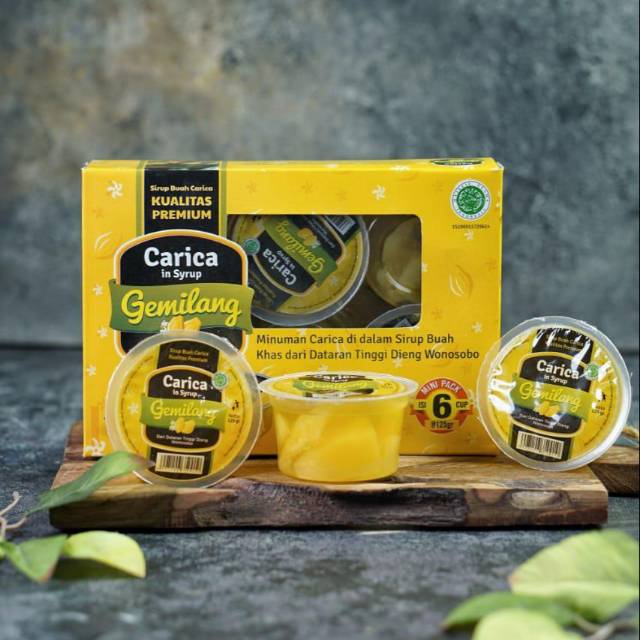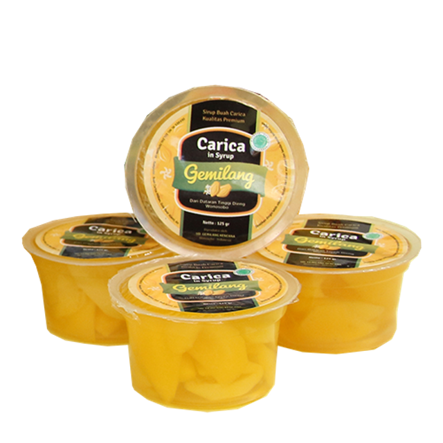 Kemasan cup plastik yang digunakan adalah food-grade, memastikan keamanan produk untuk dikonsumsi. Keunggulan Carica Gemilang terletak pada penggunaan gula murni tanpa bahan pengawet atau pewarna buatan, serta telah memiliki sertifikasi Halal. Proses produksinya melibatkan tahapan sortasi, pengupasan, perendaman air kapur, perebusan, sterilisasi komersial, hingga pendinginan dan pelabelan, yang semuanya bertujuan untuk menjaga kualitas dan memperpanjang daya simpan produk. Manisan ini direkomendasikan untuk disimpan pada suhu dingin antara 5 hingga 10 derajat Celsius agar tetap segar.