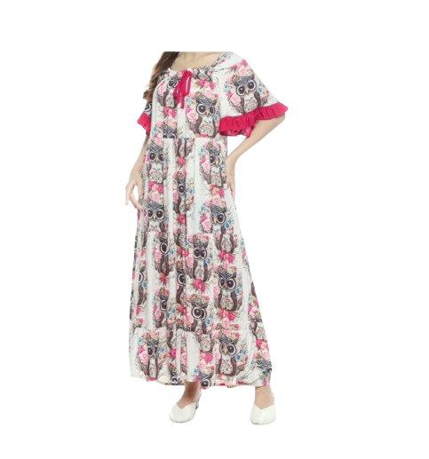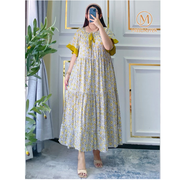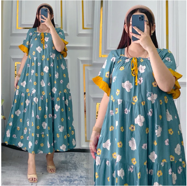 Desainnya sendiri tidak kalah menarik. Daster ini mengusung model square neck atau kerah kotak yang memberikan kesan modern dan rapi. Bagian lengannya dihiasi dengan ruffle polos yang manis, menambah sentuhan feminin pada keseluruhan tampilan. Fitur unggulan lainnya adalah desain busui friendly, dengan karet yang bisa ditarik ke bawah pada bagian dada, serta aksen kerutan dan tali di dada, menjadikannya pilihan praktis untuk para ibu menyusui. Rempel panjang di bagian bawah daster menjadi daya tarik utama yang memberikan kesan anggun dan tidak monoton, jauh dari kesan daster jadul.